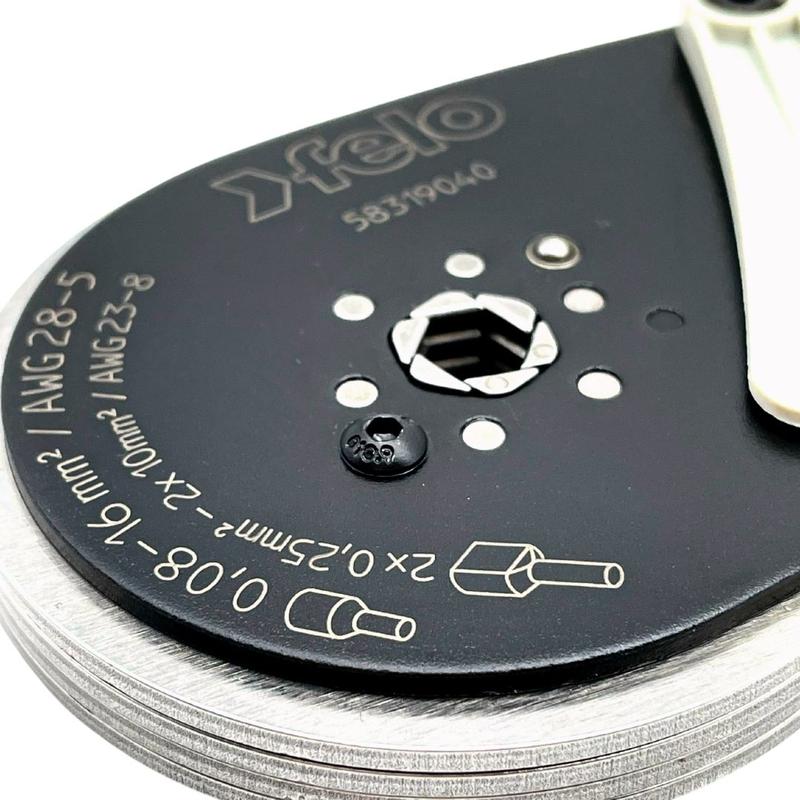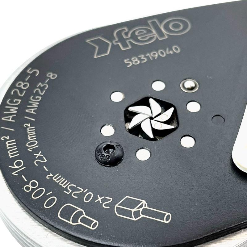 Ручной обжимник FELO 58319040 предназначен для быстрой и надежной опрессовки. Конструктивно инструмент производит гексагональный обжим для уменьшения установочных размеров кабеля. Небольшие габариты и вес инструмента облегчают работу пользователя. Рукоятки обжимника изготовлены из двухкомпонентного материала, поэтому идеально адаптируются в руке и не выскальзывают во время работы. Диапазон работы для одинарного кабеля от 0,08 до 16 мм2, а для пары – от 0,25 до 10 мм2. Дополнительно на обжимнике установлено пластиковое центрующее устройство.