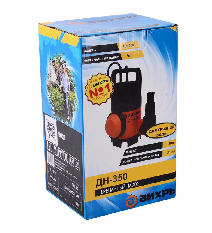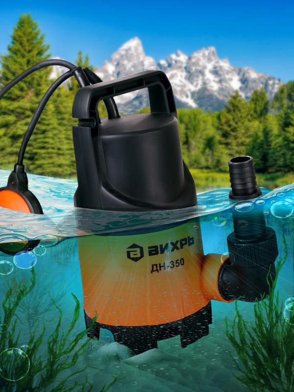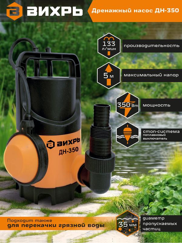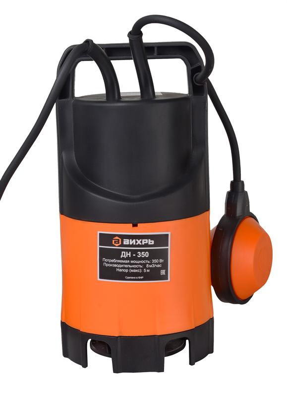 ПОПЛАВКОВЫЙ ВЫКЛЮЧАТЕЛЬ - Внешний Дренажный насос ВИХРЬ ДН-350 предназначен для откачивания и отведении воды и стоков с инородными примесями из различных водоёмов и резервуаров (котлованов, шахт, сливных ям и т.д). С их помощью можно выкачивать воду в случае подтопления жилых помещений и подвалов. Электродвигатель насоса асинхронный, однофазный с короткозамкнутым ротором. Корпус изготовле